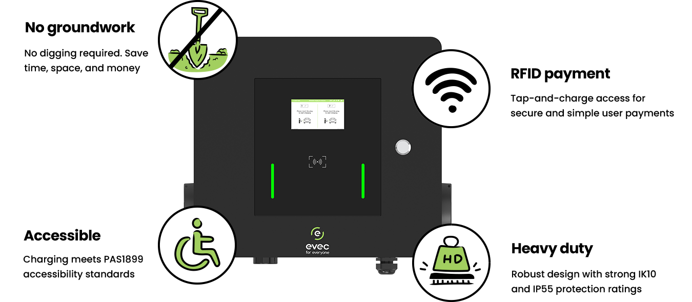 Engineered with accessibility in mind, charging sockets are positioned in line with PAS1899 specifications*, for ease of use for all drivers. The charger boasts an IK10 impact rating, three-phase PEN fault detection (no earth rod required), and comes equipped with RFID access, dynamic load balancing, app control, and built-in 4G for seamless connectivity.