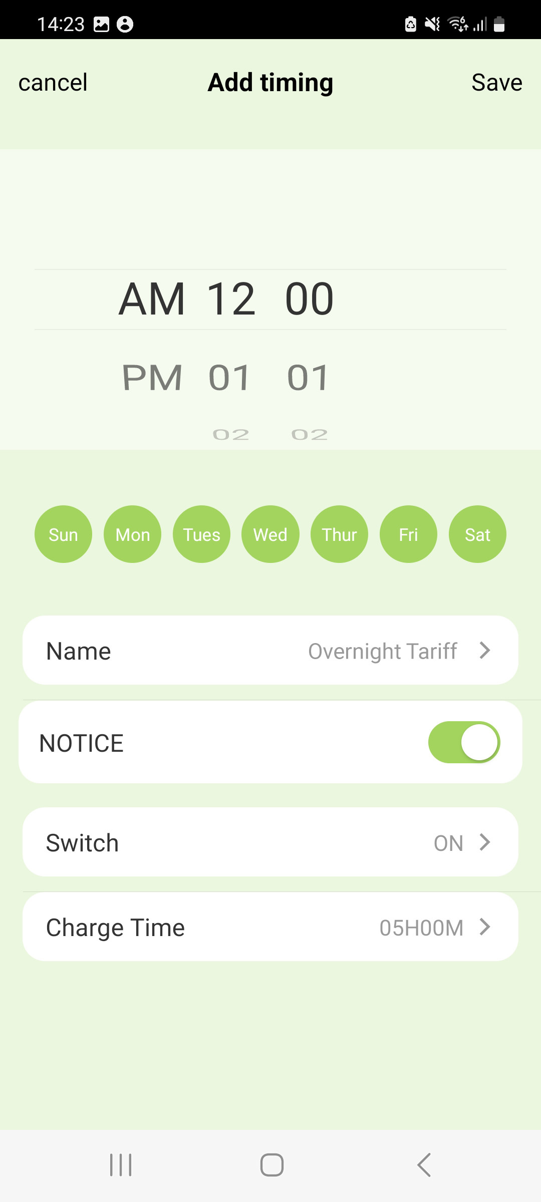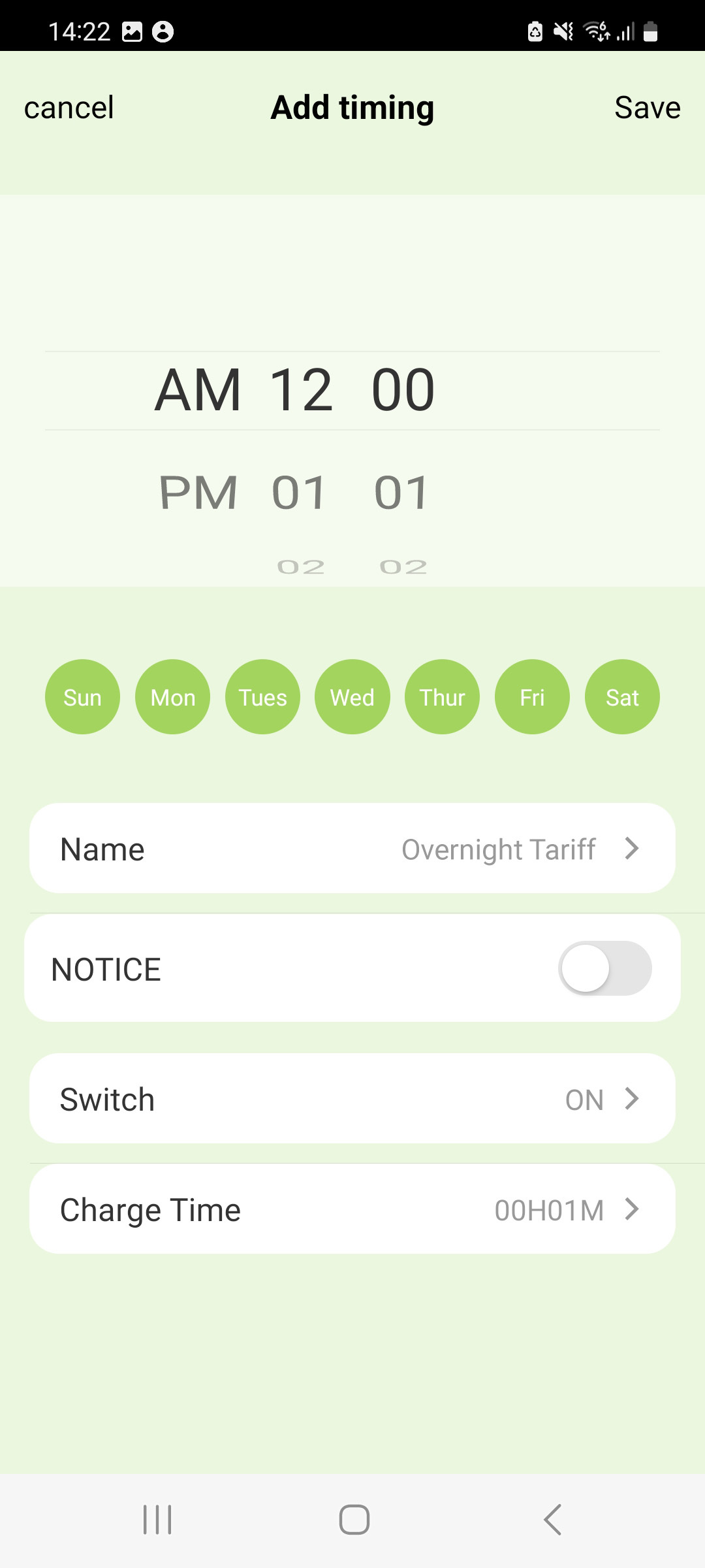 Don’t forget: Make sure you’ve selected the days of the week and set the charge duration before saving.
